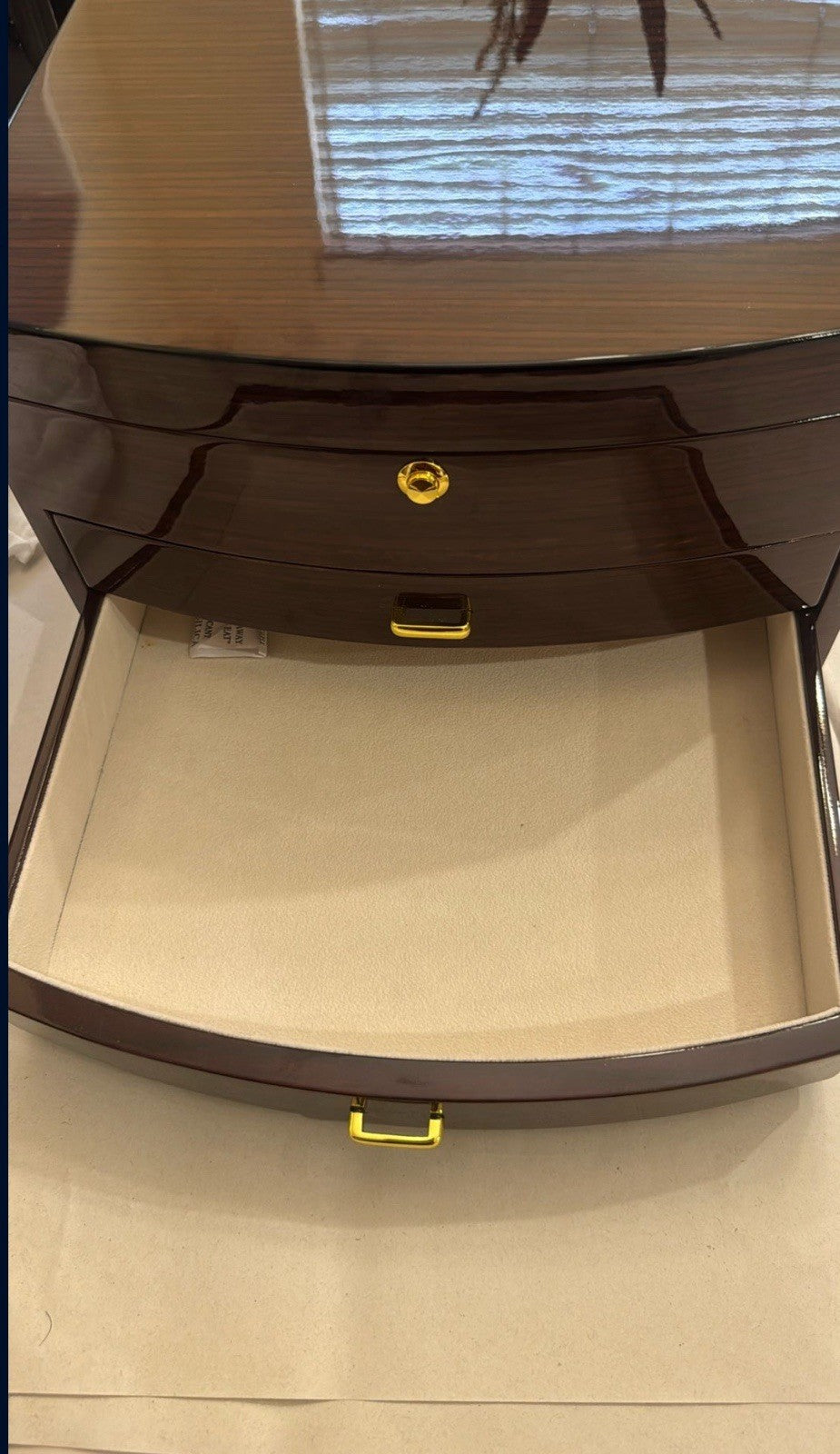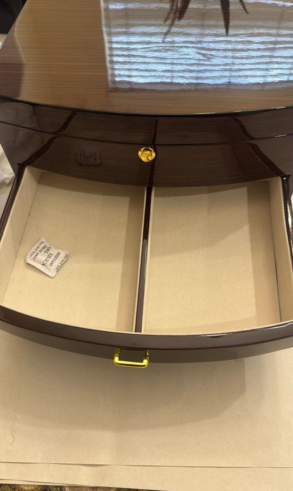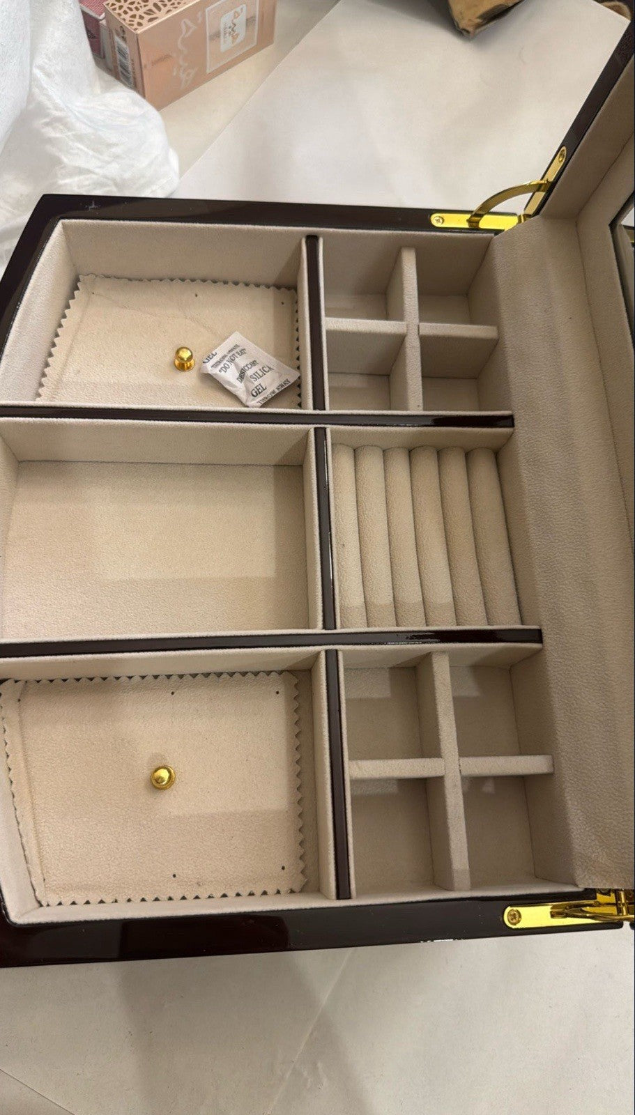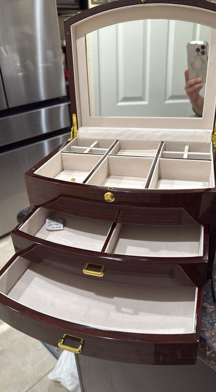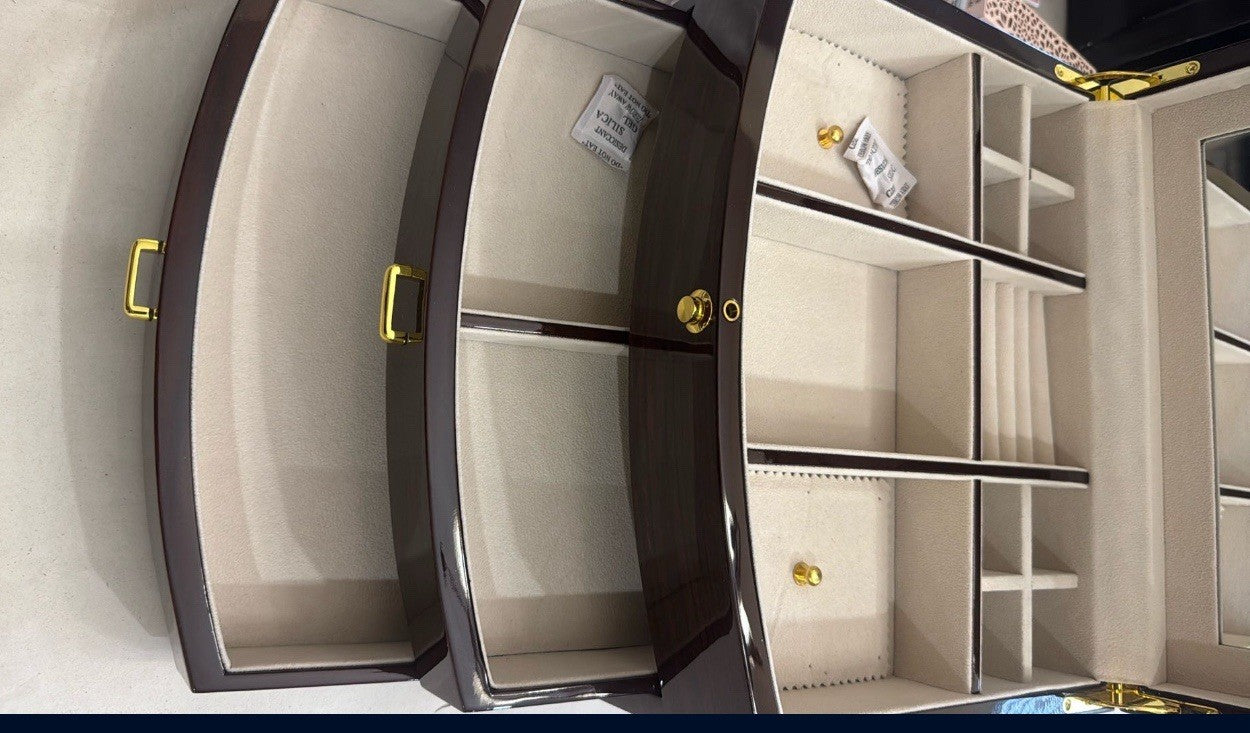 • Ample Storage Compartments - Multiple divided sections on top for smaller pieces, plus two spacious pull-out drawers for watches, bangles, and larger items.